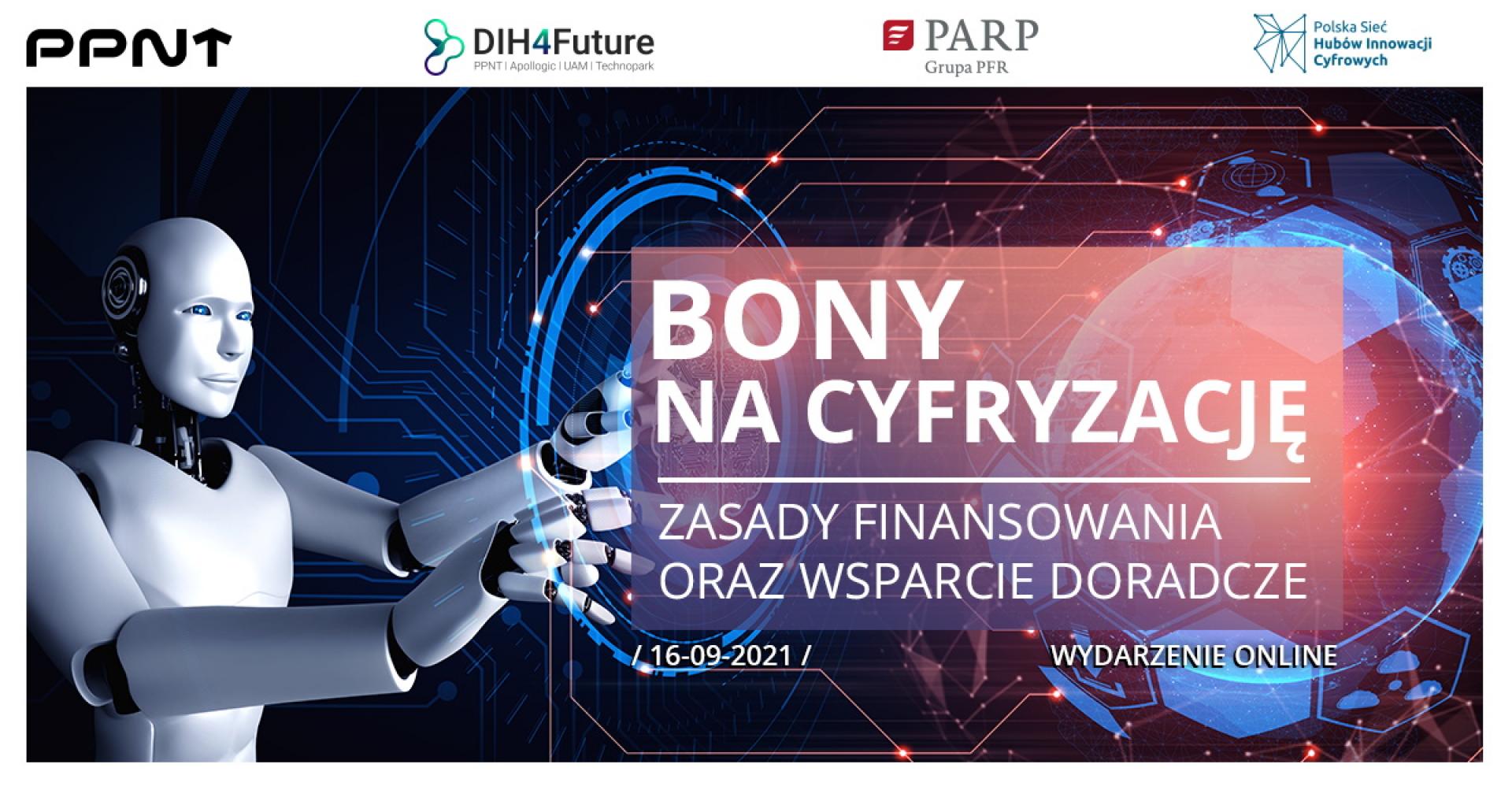 Departament Gospodarki informuje, iż 16 września o godz. 10:00 odbędzie się webinar „Bony na cyfryzację – zasady finansowania oraz wsparcie doradcze. Jest to spotkanie z ekspertem PARP oraz hubem innowacji cyfrowych DIH4Future”, które organizuje PPNT przy współpracy z Polską Agencją Rozwoju Przedsiębiorczości. Udział w wydarzeniu jest bezpłatny, obowiązuje jedynie rejestracja.