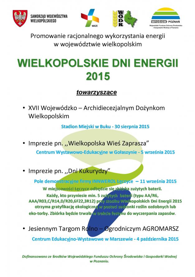 Wielkopolskie Dni Energii 2015 odbędą się w dniach:• 30 sierpnia 2015 r. - "Wielkopolskie Dnie Energii 2015" w gminie Buk (wydarzenie towarzyszące XVII Wojewódzkim – Archidiecezjalnym Dożynkom Wielkopolskim)• 5 września 2015 r. - "Wielkopolskie Dni Energii 2015" w Centrum Wystawowo-Edukacyjnym w Gołaszynie koło Bojanowa (wydarzenie towarzyszące imprezie informacyjno-promocyjno-handlowej „Wielkopolska Wieś zaprasza")• 11 września 2015 r. - "Wielkopolskie Dni Energii 2015" Pole demonstracyjne firmy INNWEROL w miejscowości Łęczyce (Łęczyce 22), (wydarzenie towarzyszące imprezie rolniczej pn. „Dni kukurydzy")• 4 października 2015 r. - "Wielkopolskie Dni Energii 2015" w Centrum Wystawowo-Edukacyjnym w Marszewie koło Pleszewa (wydarzenie towarzyszące Jesiennym Targom Rolno-Ogrodniczym AGROMARSZ: „Przyjazna energia w domu i zagrodzie")