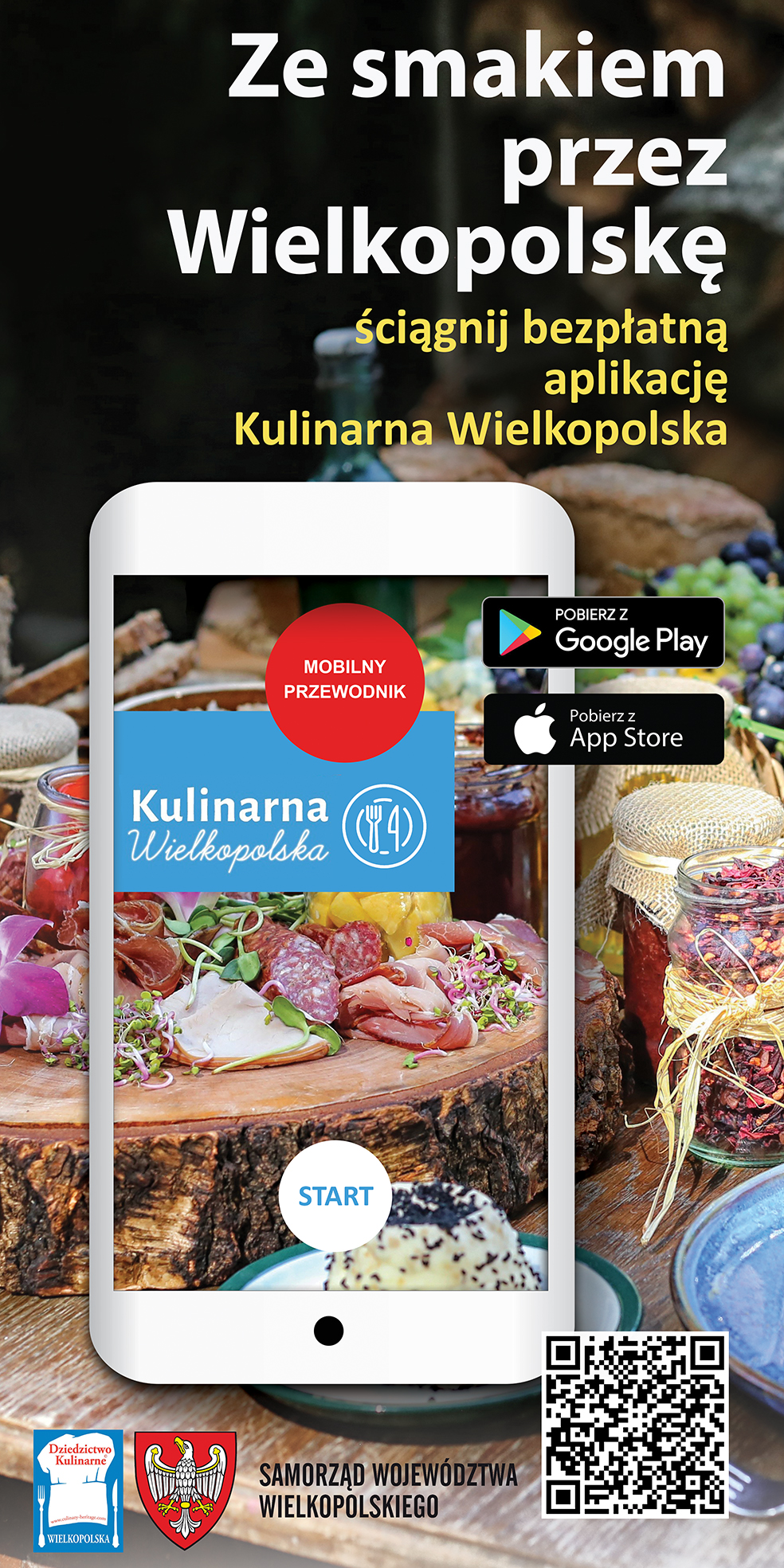 Zapraszamy na stronę internetową: www.sdk-wlkp.pl oraz do pobrania bezpłatnej aplikacji kodem QR. Sieć Dziedzictwa Kulinarnego Wielkopolska znajdziecie Państwo również w mediach społecznościowych - na Facebooku oraz Instagramie.