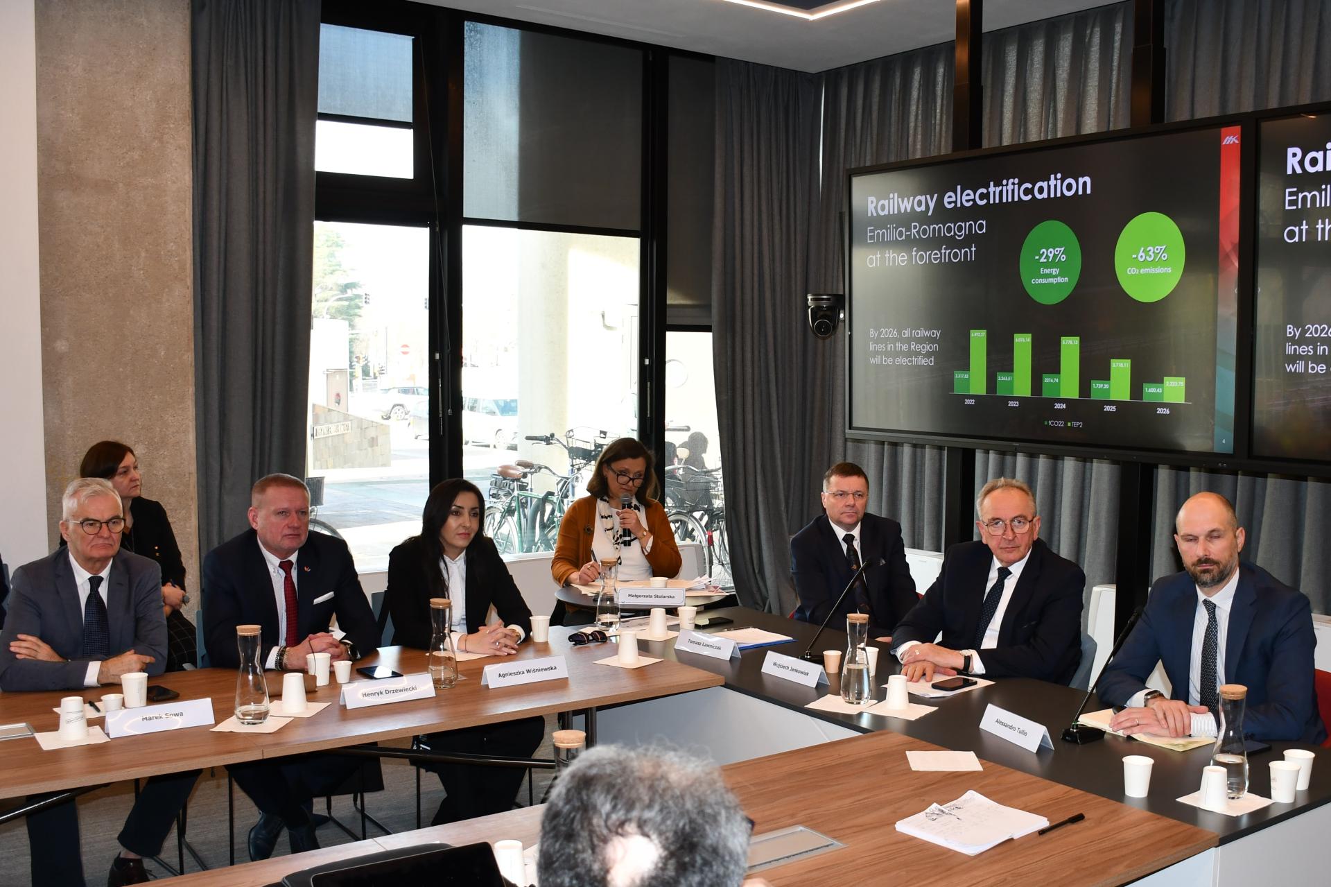 Ważnym tematem spotkań były sprawy związane z obsługą i organizacją przejazdów kolejowych, które należą do kompetencji obu regionów. Działania z tego zakresu przedstawili wielkopolskiej delegacji Dyrektor Generalny spółki Trenitalia Tper, inż. Allesandro Tullio oraz Prezes spółki FER (Ferrovie Emilia-Romagna), inż. Gianluca Benamati.