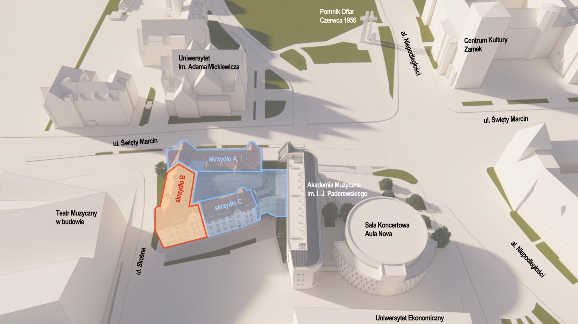 Przedmiotem projektu jest przebudowa, rozbudowa, remont i częściowa adaptacja dwóch segmentów zabytkowego budynku Akademii, zlokalizowanego przy ul. Św. Marcin 87 (na wizualizacji segmenty A i C). Ma się to przyczynić do przywrócenia obiektowi jego funkcji społecznych, gospodarczych, edukacyjnych, kulturalnych i rekreacyjnych, w tym turystycznych.